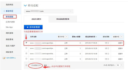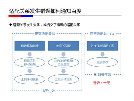 目前通過百度站長(zhǎng)平臺(tái)進(jìn)行移動(dòng)適配關(guān)系提交是大家選擇較多、也是效果最理想的方式。如果適配關(guān)系發(fā)生變化,除了修改適配文件外,記得一定要通過開放適配工具進(jìn)行文件手動(dòng)更新。